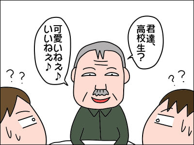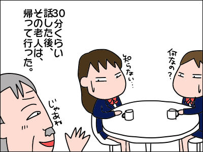 いきなり話しかけてくる老人、ちょっと気味が悪いですね。30分も話しかけてきて、また戻ってくるとか!店員さんが見える位置ならいいですが、ちょっと死角になると分かりづらいですしね…。
