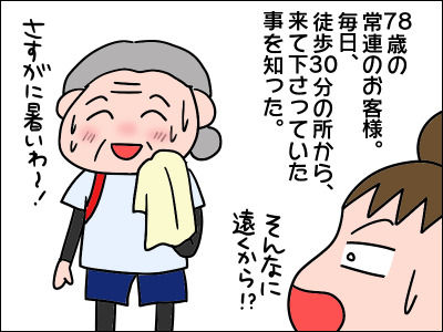 素晴らしいお婆様でございますね~。徒歩で30分くらいとは、距離として約1キロくらいでしょうかね~?