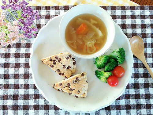 野菜スープと、ブロッコリーとトマトと、焼きたてスコーン♪