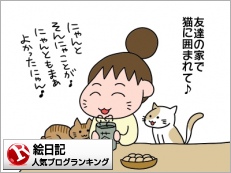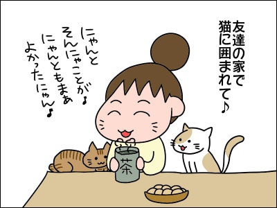にゃんこに囲まれて仲良しの友だち友だちお喋りしたりご飯食べたり。