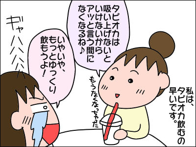 タピオカって細いストローだと なかなか飲めないので、私は力強く吸い過ぎて、喉の奥の方に入ってしまい、ガホッとなります。太いストローでも つい力強くなってしまうので、早く無くなりますよ~私も(^_^;)