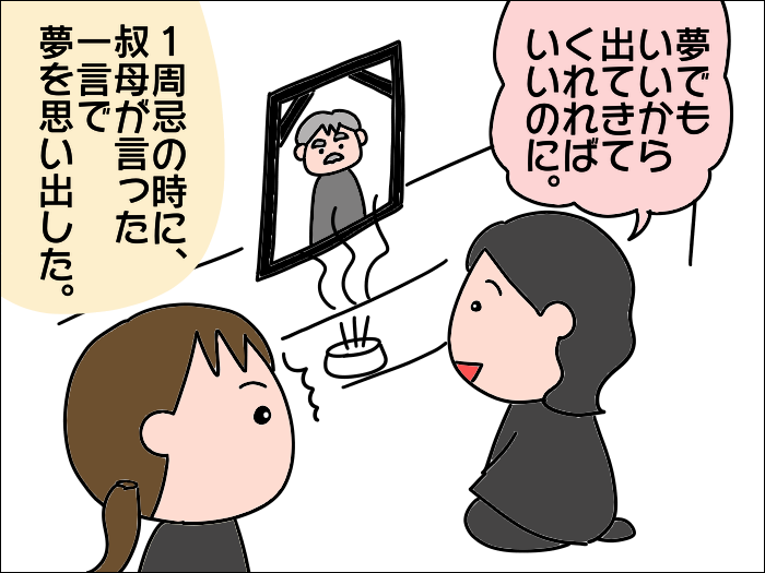あ〜確かにな、と思いました。まだ亡くなってそんなに経っていなかったし、まだまだ生きたかったはずの母だったので…混乱していたし、淋しかったのでしょう。
