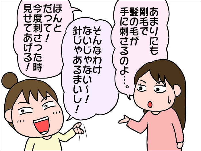 お医者さんは家に動物いる?と聞いてきたのですが我が家にはおらず、猫っ毛の娘と夫の毛とは考えられず、私の剛毛という結論に…