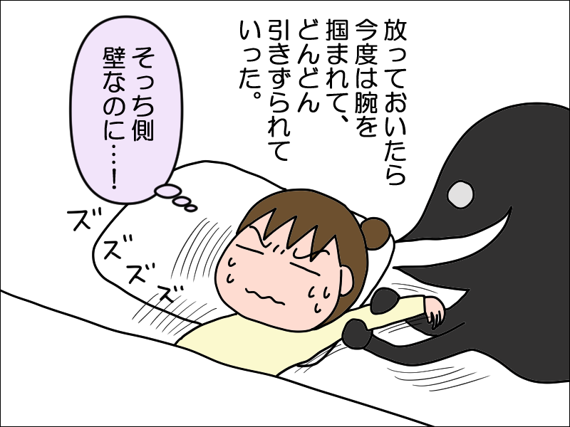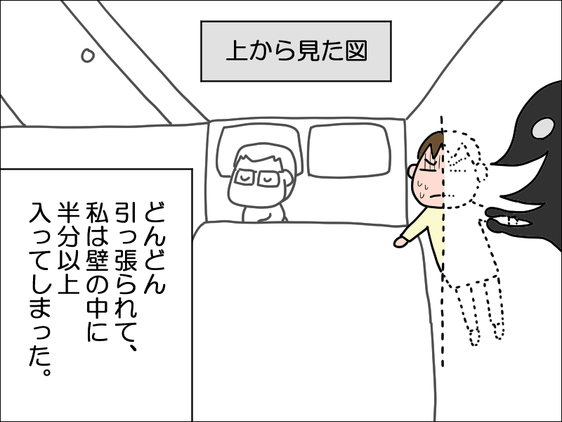 身体全部が引っ張られて壁の辺りで止まったんですけど、その頃他で似たようなことあって慣れてそのまま寝ようとしたらさらに壁通り越してしまってびっくりして目を開けたら最初の場所のままだったってことが。意識は起きてたつもりだったけど夢だったのか...?