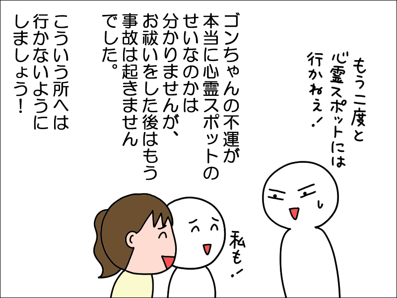 ゴンちゃんさんが大怪我からも無事に復活できていること、ご家族の力添えもあってお祓いしていただけたこと、本当に良かったです(*^^*)
