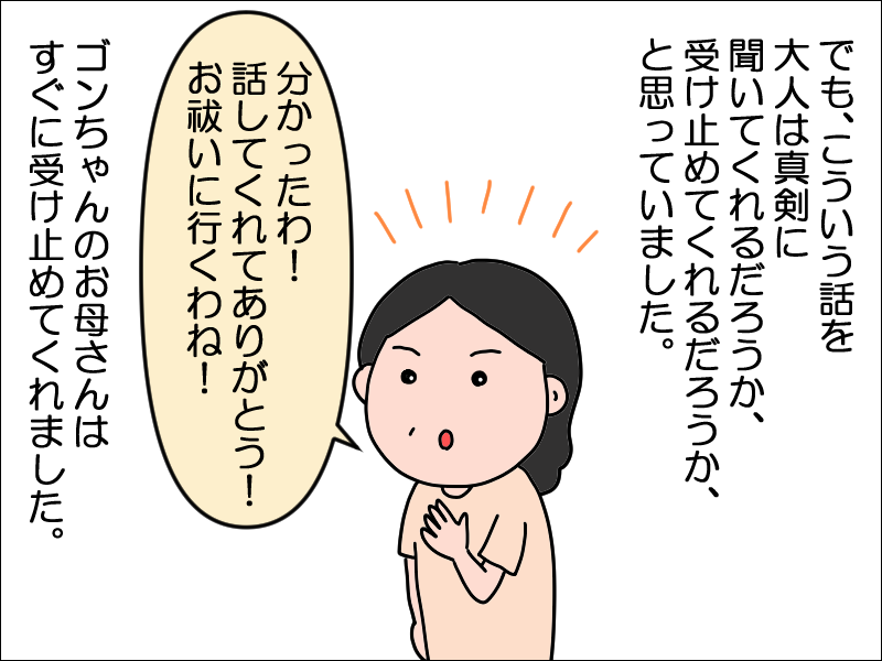 また、きちんとお話を受け止めてくださった大人がいたこと、ちゃんとお祓いに行ってくれてホッとしました。