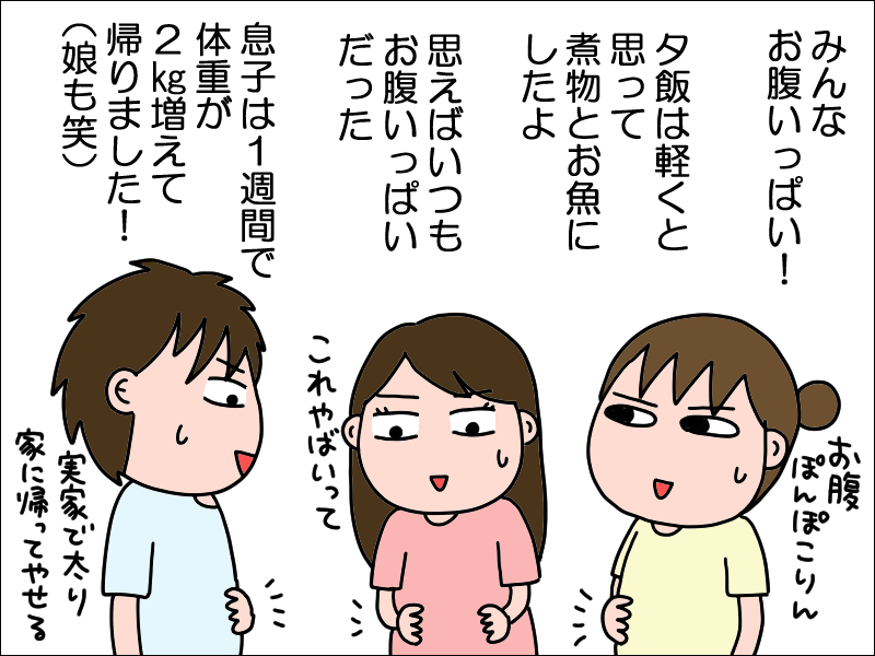 息子さんは体重が増えてまるで旅行に行ったみたいですね。連日、美味しいものを食べられて幸せですね。うちは娘が帰って来ても、あぽりさんのお子さんみたいに親と遊んでくれないのであぽりさんが羨ましいです。