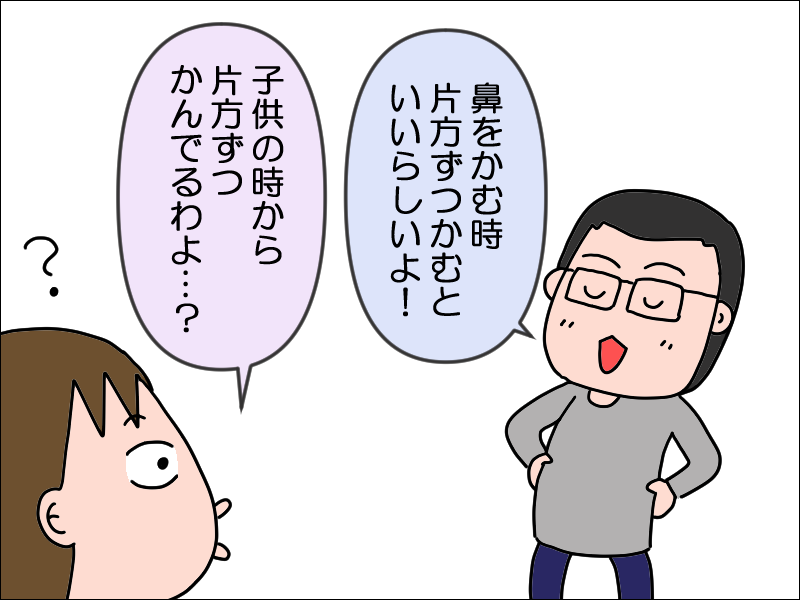 外では両手を使って鼻をかみますが、家では片手で鼻をかみます。