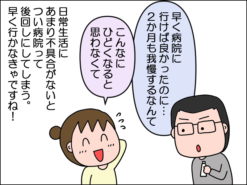 病院行くのって、時間はかかるしお金もかかるし、様子見てたら治るのかなと思って、ついつい行くのが遅くなってしまいますよね。