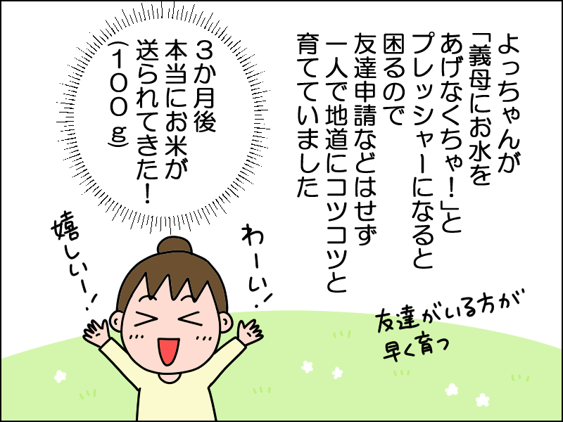 お米もらいました、あとプチトマトが送られてくるはずだけどまだ届いてません。今玉ねぎ育ててます。