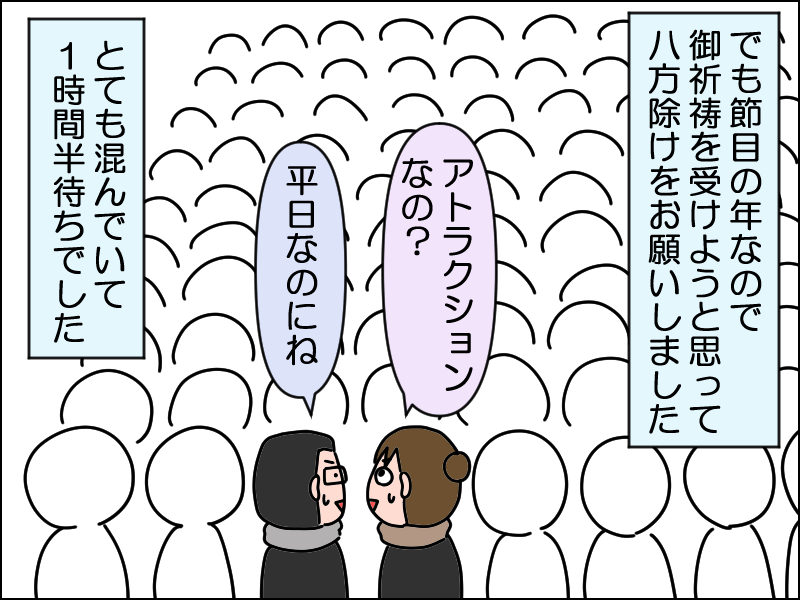 ご祈祷を頼んだら待合室にいっぱい人がいて(しかもその部屋だけじゃなく他の階にも待合室があった)、ご祈祷も3人の神主さんが並んで一斉に祈祷内容と名前と住所を読み上げ始めて驚きました