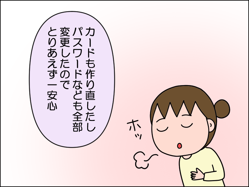 すぐに削除してパスワードも変更し、翌日クレカの会社に電話。私のクレカは銀行のカードでもあったので、銀行の窓口に行っていろいろ手続きしました。